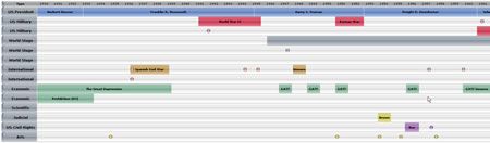 I'm not crazy about the design (a little too 'web 2.0' for me) but I do like the idea of giving each category it's own timeline layer. This allows users to explore and discover concurrent events across categories.